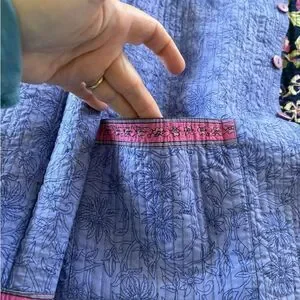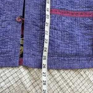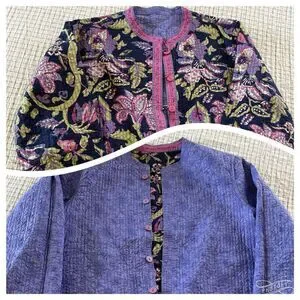 Reversible jacket with vibrant floral pattern on one side and textured purple on the other. Features pink button accents.