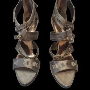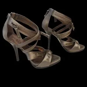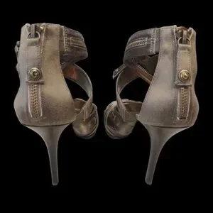 Step out in style with these elegant bronze strappy heels with zipper details. 5" heel. All offers welcome and appreciated.