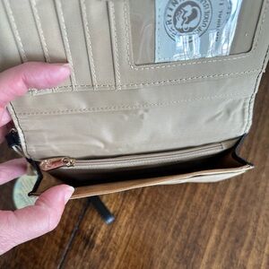 NWT! Linen and genuine leather wallet wristlet in an earth tone paisley pattern. Zipper pocket inside and card holder slots. Snap closure. Black leather writ strap. Pocket on outside. Mermaid charm.