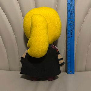 This is a pre-owned, handmade plush doll, approximately 11 inches tall. The doll features a yellow felt-like hair, button eyes, and a stitched outfit with red, gray, and black details. The body is constructed from a beige felt-like material. Great pre-owned condition.