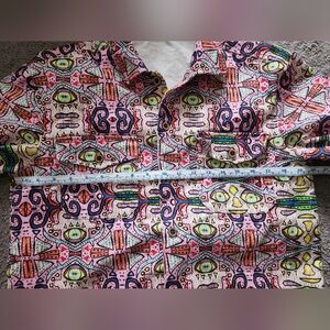 Button up long sleeve shirt. Colorful geometric pattern. Size small. See measurements in photos. Excellent preloved condition.