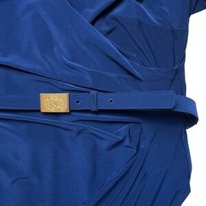 Blue, Back Zip Closure, Jersey Stretch Knit Fabric, Flattering Side Ruching, 3/4 Sleeve, RL Logo On Belt