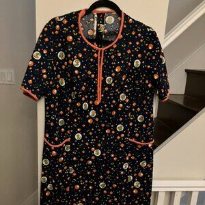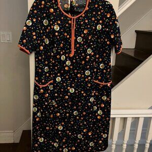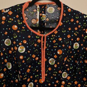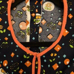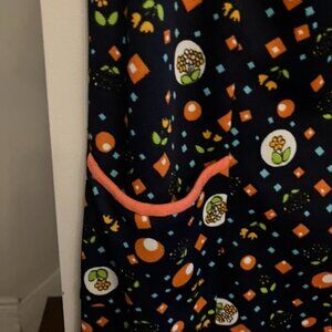 Handmade dress, no tags. Very fun print, nice orange detail on the neckline.