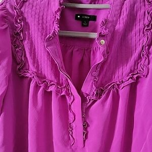 Bright purple long-sleeve blouse from J.Crew, crafted in 100% silk. Features elegant ruffles along the placket and a gathered neckline. Lightweight and flowy — perfect for work, brunch, or dressing up your favorite jeans.