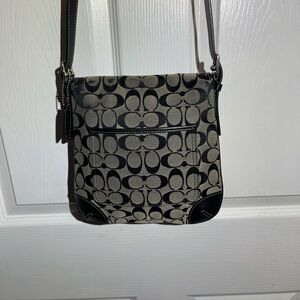 Vintage Coach Soho Buckle Flap shoulder bag in black and gray signature canvas and black leather trim.