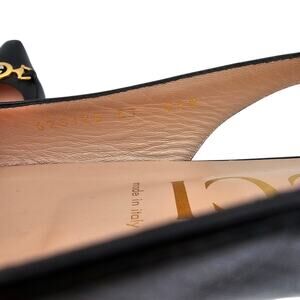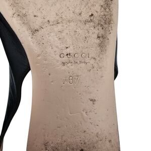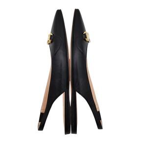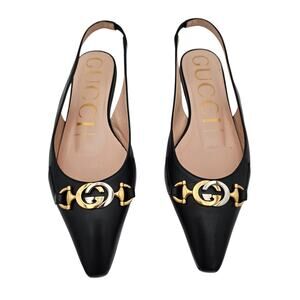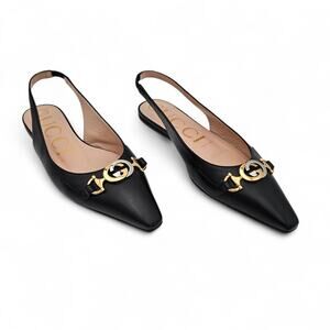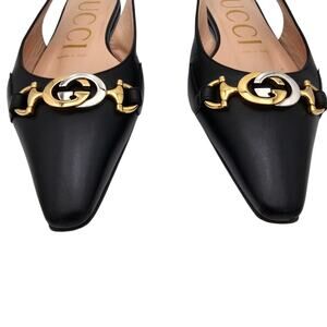Gucci GG Horsebit Zumi Slingback Flat Black Leather Gold Silver Size 37 US 7
