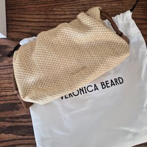 Chic beige woven crossbody bag by Veronica Beard. Features drawstring closure and sleek design.