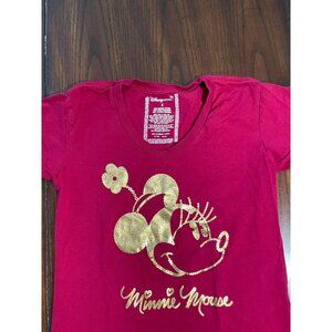 Deep red color V-neck t-shirt with gold chain Minnie Mouse face and spell out. EUC