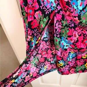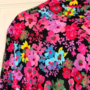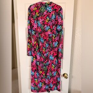 Vibrant floral dress with long sleeves. Features a colorful pattern with pink, blue, and green flowers. This dress is new and has never been worn. Excellent condition! Stretch and flowy. 1X is equivalent to size 16/18W