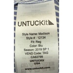 A classic blue and white striped shirtdress by UNTUCKit. This piece features a flattering tie waist, a collared neckline, and long sleeves with button cuffs. Its versatile design makes it perfect for a professional office setting or a relaxed weekend brunch.