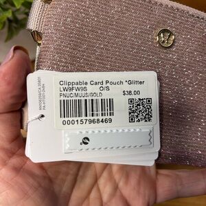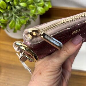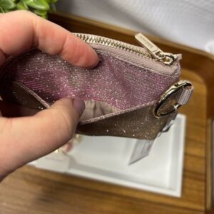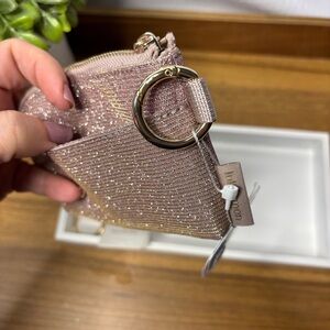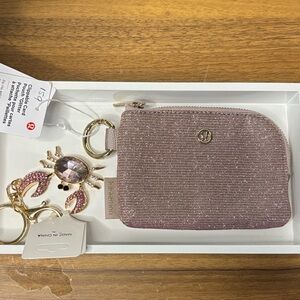 Chic and compact card holder. Features a shimmering pink and gold material. Zipper top. Also included is a cute crab keychain/bagcharm. Both NWT