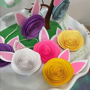 Charming bunny ear floral ornaments. Hand Crafted. Features vibrant pink, purple, yellow, and green hues. Ideal for festive gatherings.