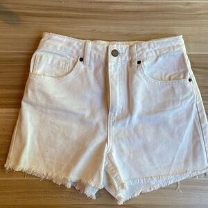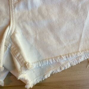 Chic cream jean shorts with a frayed hem. Perfect for casual wear.