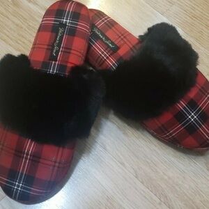 Victoria’s Secret Signature Satin Slippers in Red and Black Plaid with Faux Fur Size 8/9 Like new
