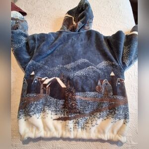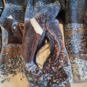 Denali Vintage Sherpa women's Large reversible fleece jacket thick, 1 side all over Mountain cabin design blues, brown white, VGUC warm, pockets on both sides, elastic on waist