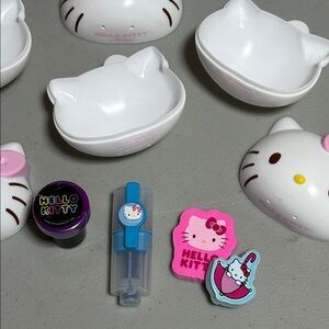 Hello Kitty Easter Themed Bundle includes 3 hello kitty Easter eggs with hello kitty surprises inside making the ready for an egg hunt or add to basket. Also included is a book of Hello Kitty tattoos and a book of Hello Kitty Stickers (slight tear in cover) and last you get a Hello Kitty necklace and bracelet set.