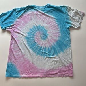 Lisa Frank Tikanni the husky puppy graphic and tie dye short sleeve t shirt. Rare and hard to find tee. Tie dye background in a swirl of blue, pink and white featuring a bold, colorful graphic of the playful pup. Super soft and cozy 100% Cotton.