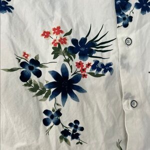 Upgrade your casual style with this floral button-down shirt. Featuring a white base with blue and red floral patterns, it's ideal for relaxed outings.