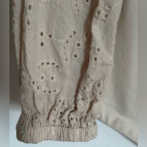 Belle By Kim Gravel Eyelet Everything Mix Media Top. This elegant Sandbar color boho style top features intricate lace sleeves and a stylish tassel tie. Perfect for any occasion, it combines comfort with a touch of sophistication. 95% cotton / 5% spandex / body 100% cotton sleeves.