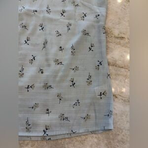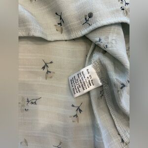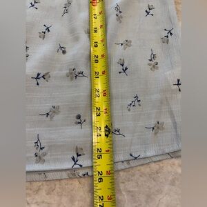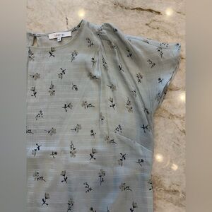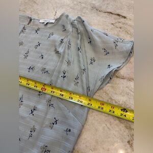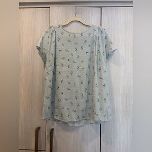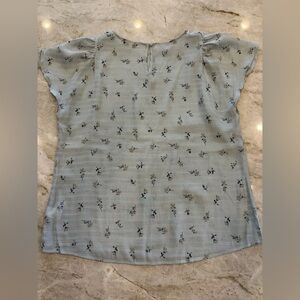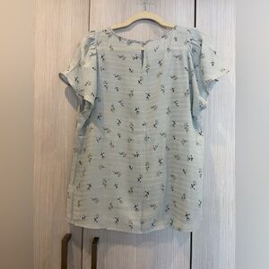 Fun2Fun blouse in a soft light blue with a tiny floral print throughout. It has short flutter sleeves and a relaxed shape that drapes nicely without clinging. The back has a small keyhole with a button closure, and it comes with an extra button still attached.