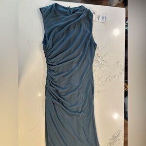 Elegant, long blue, midi dress. This is a fancier fabric that, added to the length, is a special occasion piece, but had it fit me better, I would have gotten it hemmed to right below my knee to be able to wear it to work. The color is lovely and can be worn cool with black shoes or warmed up with browns, nudes, or metallics. An excellent deal!