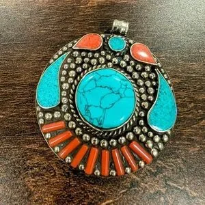 Unique pendant from Tibet, 2 inches in diameter. New, but with some light scratches on the back from shipping. I am not a gemologist, so I cannot confirm if the turquoise or coral are genuine.