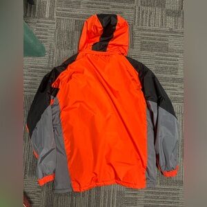 Men’s two XL winter coat by cb sports advanced performance systems. This coat has a zipper down the front with additional Velcro that secures it. There is one piece of Velcro that is becoming unstitched. I don’t think it matters cause there’s other pieces. There are 3 pockets on the outside. A pocket on the inside. Cinched around the wrist. I’m going to throw this in the washing machine, but it does look like there are some light dirt shades on this coat from where although I truly feel like the coat is in very good shape. Lots of life left. There is a hood that is fleece lined. That can come off with the zipper. It has Velcro at the chin. It’s a heavy coat that my husband used to go out and shovel snow in.
