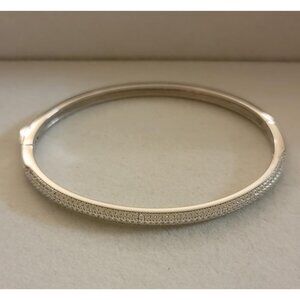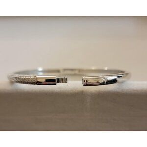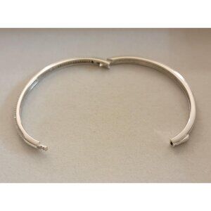 ✨ Sleek sterling silver bangle featuring round moissanite stones in a pave setting. Designed with a hinged structure and secure locking closure for a comfortable, structured fit.