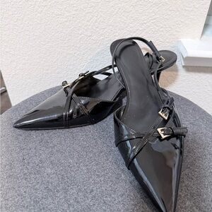 Sleek black patent slingback heels with a sharp pointed toe and delicate buckle straps.