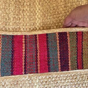 Minor wear on one corner, front has two pockets. Handles are fake leather and have cracked but still function, would be cute wrapped with scarf or rope.