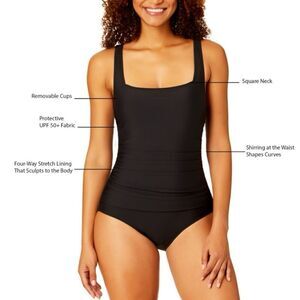 Featuring a square neckline, and shirred front panel that creates a flattering fitted look. Pull on styling paired with removable cups and a full coverage bottom for modesty. Anne Cole suits are fully lined and machine washable for easy wear and care. Use the adjustable shoulder straps to provide the perfect fit no matter your body shape, giving the option for a more snug or relaxed fit.