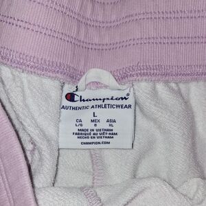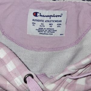 Chic light pink gingham hoodie with matching shorts. Features iconic Champion logo. Perfect for casual wear. Shorts are a size Large, Hoodie is an XL.