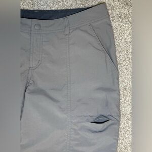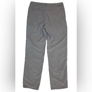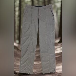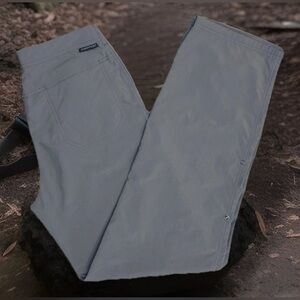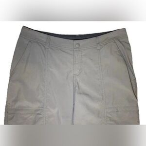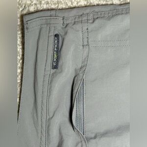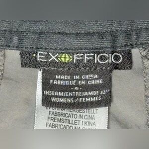 The product is a pair of ExOfficio women's gray pants in size 4. Made from 100% nylon fabric, these gorpcore pants feature a solid pattern with a mid-rise and straight leg style. They are designed for hiking, camping, and other outdoor activities, with features like insect guard technology, roll-up snaps to convert to capris, six pockets (two which are zip) for convenience. Perfect for travel and casual occasions, these pants offer both style and functionality for adventurous women on the go. 30" waist with 31" inseam. Excellent condition.