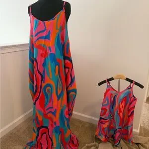 Adorable Mommy and Me matching dress set featuring a bold, colorful abstract swirl print. Perfect for summer outings, vacations, family photos, or special occasions.