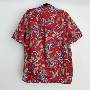 Vibrant red shirt with paisley pattern. Short sleeves. Button-down style. Perfect for casual outings.
