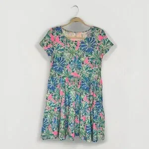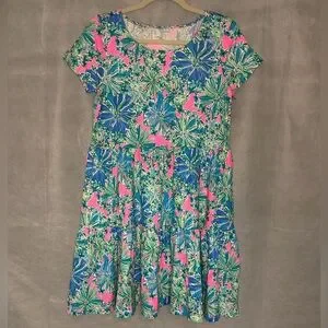 The Lilly Pulitzer Geanna Short Sleeve Dress in Soleil Pink is a vibrant and stylish option for any woman's wardrobe. Featuring a fun and colorful floral pattern, this knee-length dress is perfect for casual outings, parties, or even light travel. Made from comfortable cotton material, this fit and flare style dress in size S is sure to bring joy to any day, especially the ones spent embracing the good hare with a colorful and lively attitude.