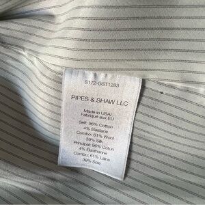 Structured. Semi-fitted silhouette. Faux double-breasted button style. Shoulder pads. Long sleeves with five button cuffs. Inverted notched collar with contrast detail (to be worn up or down). Hook and eye front closure. Welt pockets at bust and waist. Inner zip for the dickey insert. Straight hem with back vent. Lined, no sheerness. Midweight fabric with no real stretch. Made in USA (of Italian material). Dry clean only.