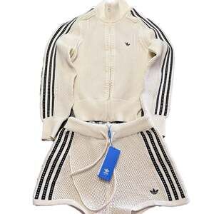 Adidas Originals Crochet Track Top and Shorts Set, Off-White/Cream, Women's Size Xs— New with Tags. This unique two-piece set features a bohemian-inspired crochet knit construction combined with classic sporty aesthetics. The track top includes a full-zip front, high collar, and the iconic three-stripes branding down the sleeves, while the matching high-waisted shorts feature a drawstring waist for a custom fit. Both pieces are adorned with the signature Trefoil logo embroidery.