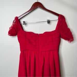 Elegant red midi dress. Features ruched bodice and puff sleeves. Perfect for special occasions.