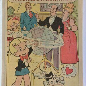 "The Treasure of Isla Rica"; Part 1 of 3: Richie travels with his father to inspect the newest addition to their oil interests and discover the property may contain a treasure. One-page Richie Rich story. 1-page Little Dot car wash story. "The Jungle Menace"; Part 2 of 3: Richie and his father continue their search for the treasure of Isla Rica. 2-page illustration/poster of the Harvey Comics characters. "Richie Rich and the Real Treasure of Isla Rica"; Part 3 of 3: Richie and his father discover the true treasure. One-page story with Lotta Plump and Mrs. Plump. "Uncle Blunder"; Dot visits her Uncle Blunder, who feels the need to punish himself after he blunders a task; 36 pgs., full color. Cover price $0.75.