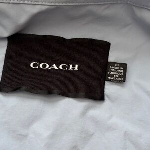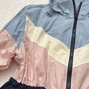 Coach Stylish colorblock windbreaker with hood. Features blue, pink, cream, and navy sections. Is not lined, just a light windbreaker. Has adjustable pulls at waist, sleeves and hood. Excellent condition. I haven’t seen this particular style in a long time. I just don’t wear it as much anymore. Smoke free home