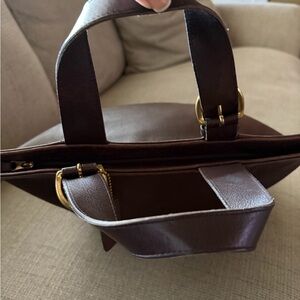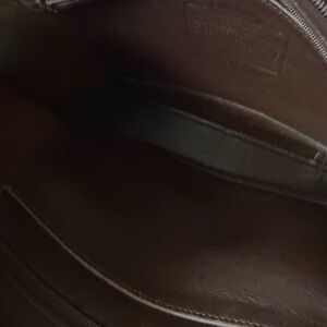 Coach 4133 leather tote. Sophisticated dark brown leather tote. Features sturdy handles and gold-tone accents. Ideal for daily use. Leather has some marks from normal wear. 13” across top and 8” high.