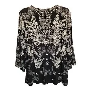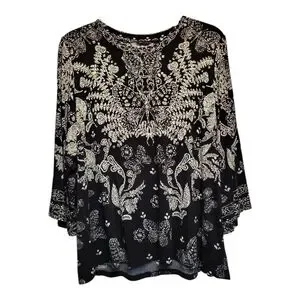 Elegant and comfortable black blouse with intricate cream floral designs and a bit of stretch. Embellished with an ornate eye-catching pattern, the Janie Favorite Bell Sleeve Top is crafted from a lightweight and breathable fabric. Featuring a crew neckline and a relaxed-fit bodice, this breezy top is finished with 3/4 length bell sleeves. Pair with a skirt and leather sandals for a polished weekend look.
