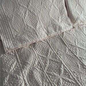 Charming light pink quilt with delicate stitching. Enhances bedroom elegance. Ideal for a cozy ambiance. Very good condition. Freshly laundered. Only used for a couple months (my husband didn’t care for the pink🙃). Closest color is the photos of the shams as it is appearing lighter on the bed. I photographed both sides to show condition. Cannot be bundled requires maximum shipping label I will cover.