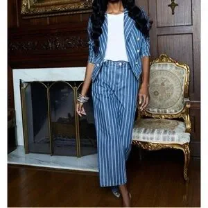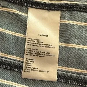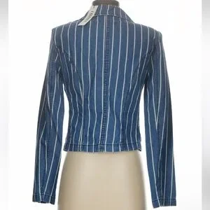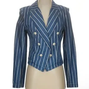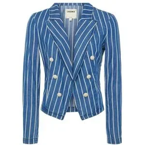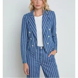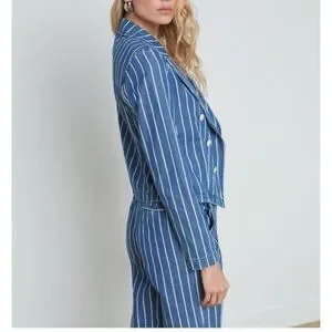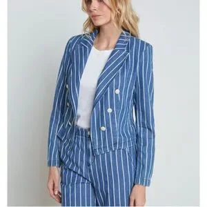 Tailored to a cropped fit, L’Agence’s striped Wayne denim jacket is crafted of stretch denim to a double-breasted silhouette. Size S and New with tags. Retail $425.