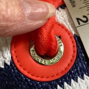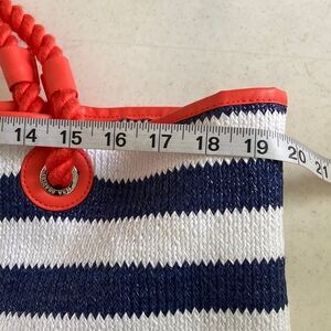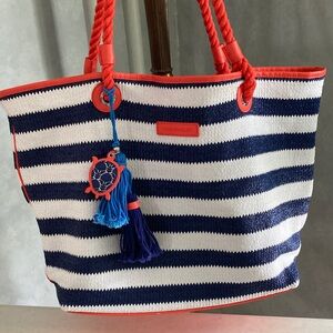 Chic tote with navy and white stripes. Features vibrant orange accents. Ideal for daily use.