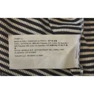 The Theory Button-Hem Long-Sleeve Tee in Striped Stretch Knit Size L is a stylish and versatile top for women. Made from a blend of polyester, cotton, and spandex, this tee offers a comfortable and stretchy fit. The classic/fitted sleeve design and button accents add a touch of sophistication to the casual garment. Easy to care for with its machine washable fabric, this tee is perfect for everyday wear in a vibrant multicolor striped pattern.