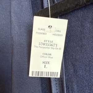 Nice, new with tags navy wrap around blazer style sweater. This is The Passporter style. Removable shoulder pads. Pockets, very soft material. Size large.