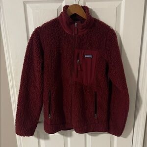 Warm sherpa jacket by Patagonia. Features zippered pockets and cozy texture.