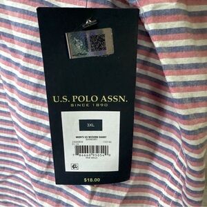 The U.S. Polo Assn. #11694 Men's Striped Short Sleeve Button Up Woven Shirt in 3XL size is a classic and preppy piece made from 100% cotton fabric. This multicolor shirt features a collared neckline, button-down closure, and a front pocket detail. It is a versatile and high-quality addition to any man's wardrobe, suitable for casual occasions while maintaining a stylish and put-together look. Ideal for machine wash and care, this woven shirt offers comfort and durability for everyday wear.